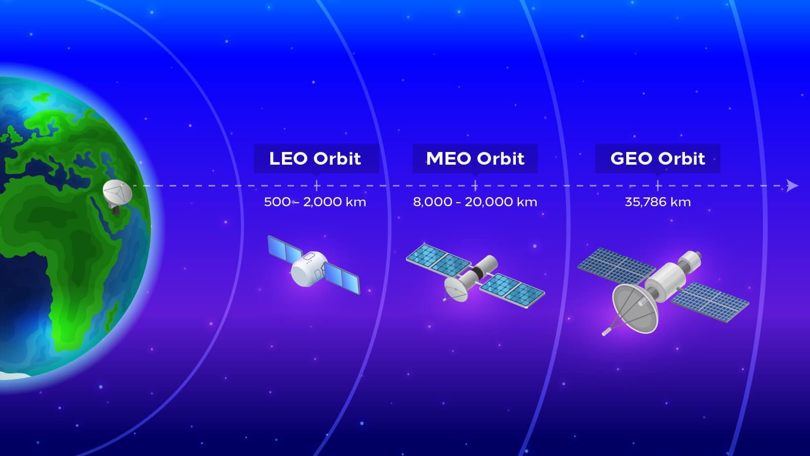 Most current Amateur Radio satellites (or OSCARs, for Orbiting Satellite Carrying Amateur Radio) are in Low Earth Orbit (LEO). These are in orbits that are mostly circular at altitudes somewhere between 400 kilometres (250 miles) to 1,300 km (800 mi) above the surface of the earth. The higher the satellite's orbit, the larger its footprint (the larger the circle of stations on the ground that will have the satellite in view), above their horizon, at any given time. Amateur radio satellites may also orbit in Medium Earth Orbit 9MEO) at altitudes between from 2,000 kilometres (1,240 miles) to less than 35,786 kilometres (22,236 miles). 35,786 kilometres is the altitude for a geosynchronous orbit (GEO), meaning that the satellite takes one day to complete an orbit. They return to the exactly same point in the sky after one day. They could rotate in the same direction as the earth or in opposite direction.