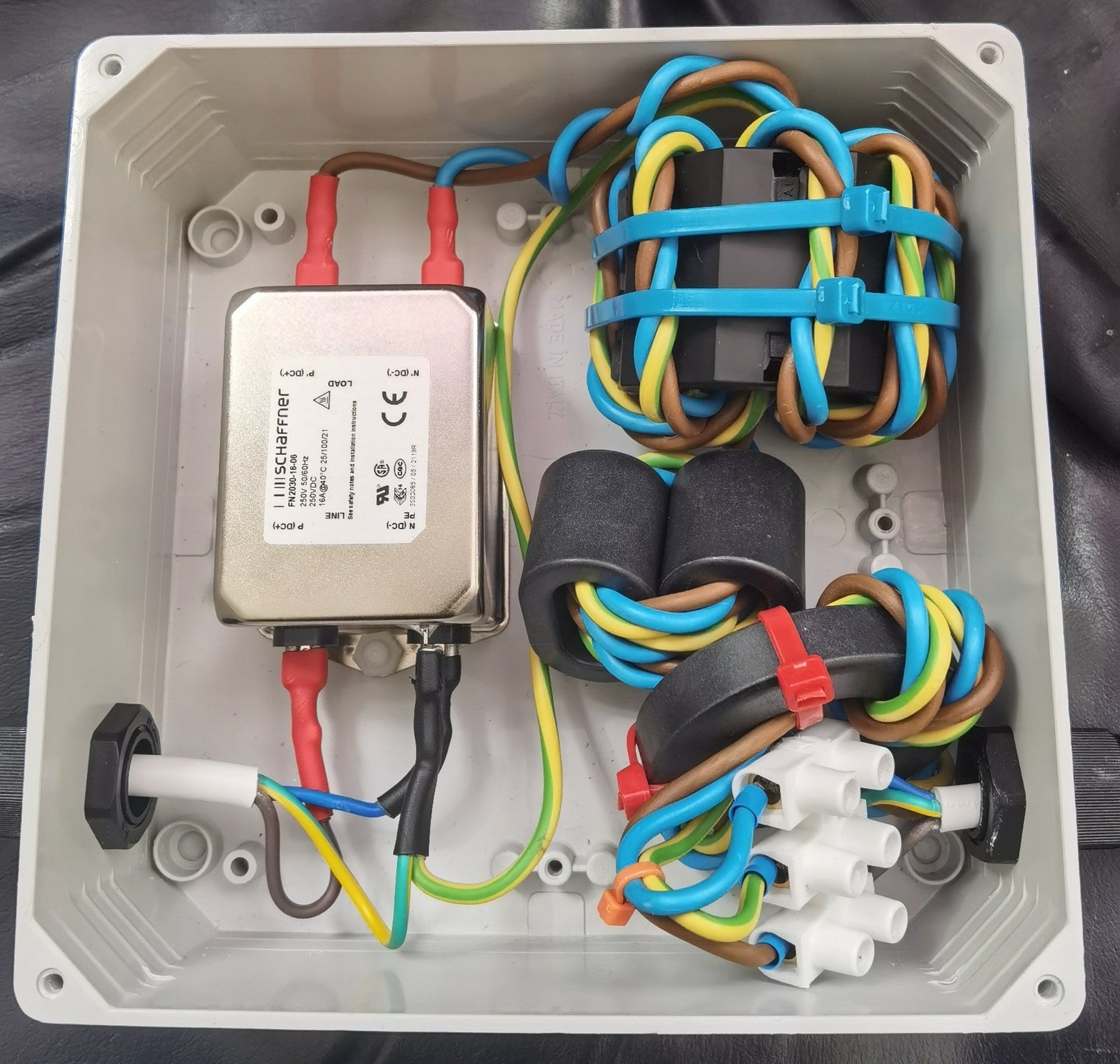 This is based on a shack mains filter described by GM3SEK. The aim is to filter all power entering the shack before it connects to all equipment. The purpose is to remove interference which can cause increased QRM on the receiver. The design feeds power to the shack via a Schaffner FN2030-16-06 power line filter before passing through a type 31 clip on ferrite then a binocular ferrite core and finally a type 43 ferrite.